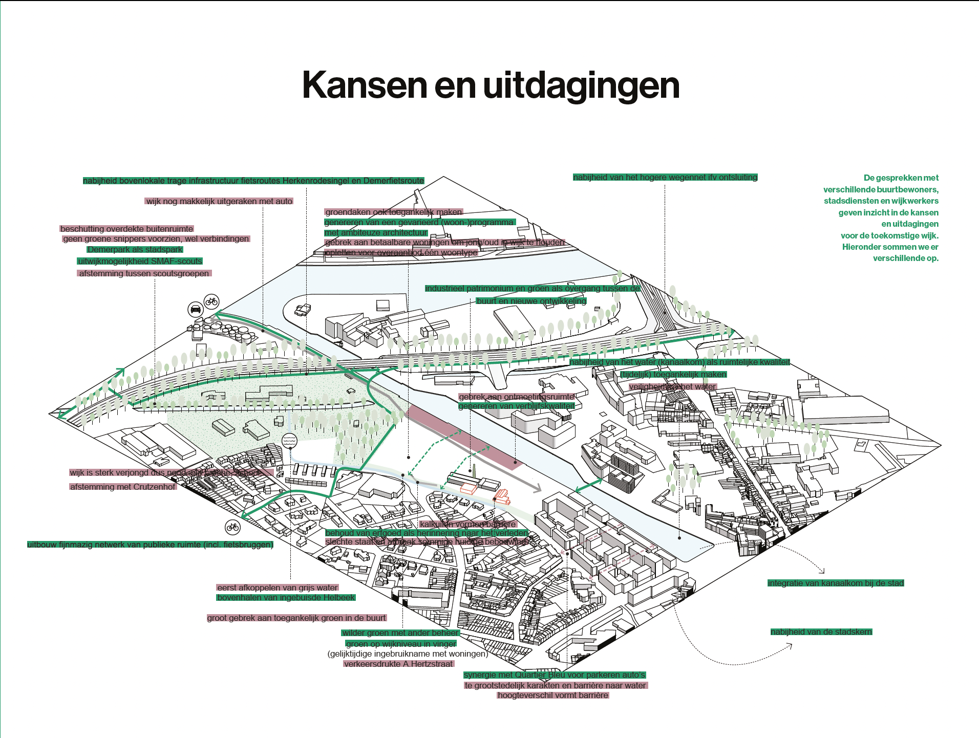 In order to arrive at supported ambitions, we conducted interviews, a walk with local residents, thematic work sessions and public events. The briefing of the designers was the final element and also the call for further involvement in the design process.