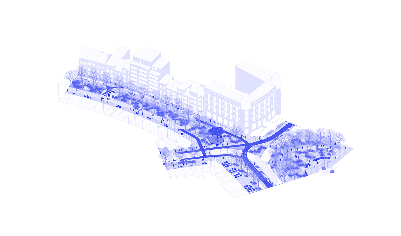 The team Basil Descheemaeker - Plus Office Architects bvba - Traject - Endeavour combined an update of the mobility study, new traffic scenarios, case studies on both squares and a design manual for the public space into a supported master plan.