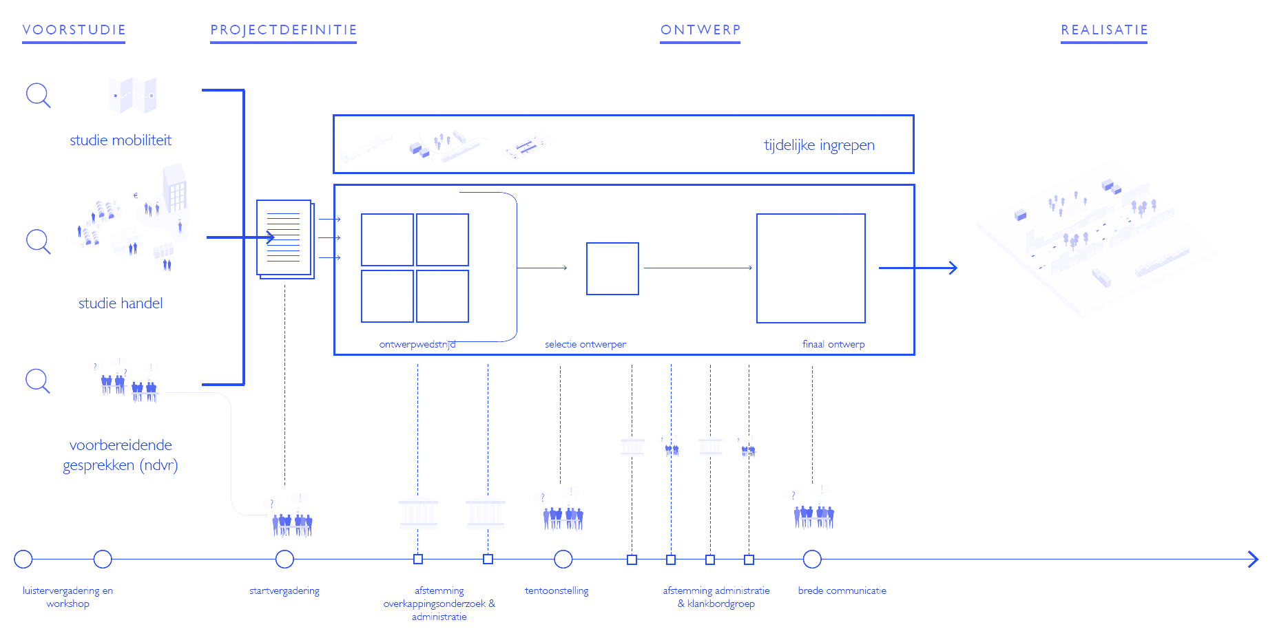 To arrive at a supported design for the Louizalaan-Naamsepoort we combined listening meetings and workshops with a translation into spatial preconditions for further design and advice for the project definition.